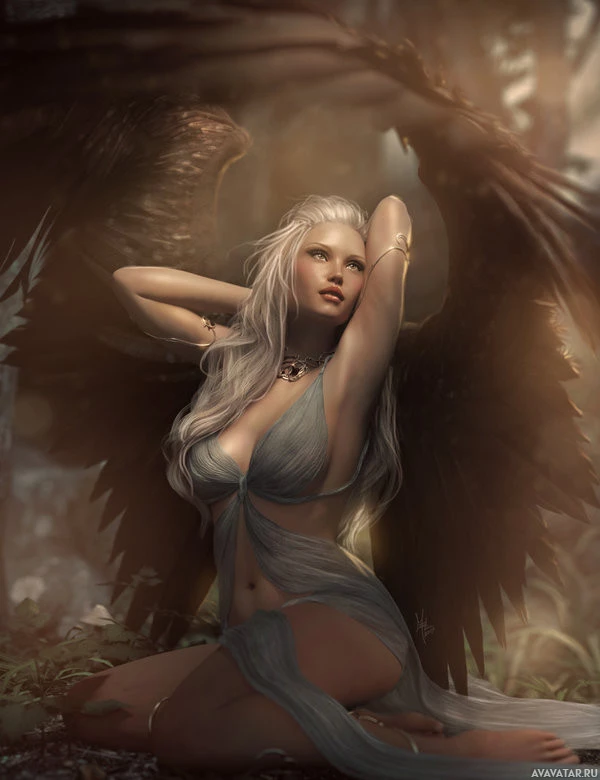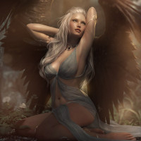 an expressive pose with one hand resting thoughtfully on her hip and the other gently touching her wing, which adds to the overall mystical and fantastical nature of the image.