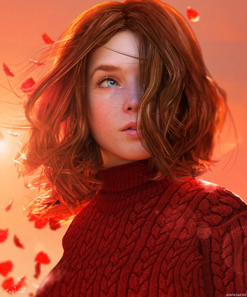 a neutral expression on her face and appears to be looking directly at the viewer. Her hair is styled in waves and cascades over her shoulders, while some strands are blowing in front of her face due to