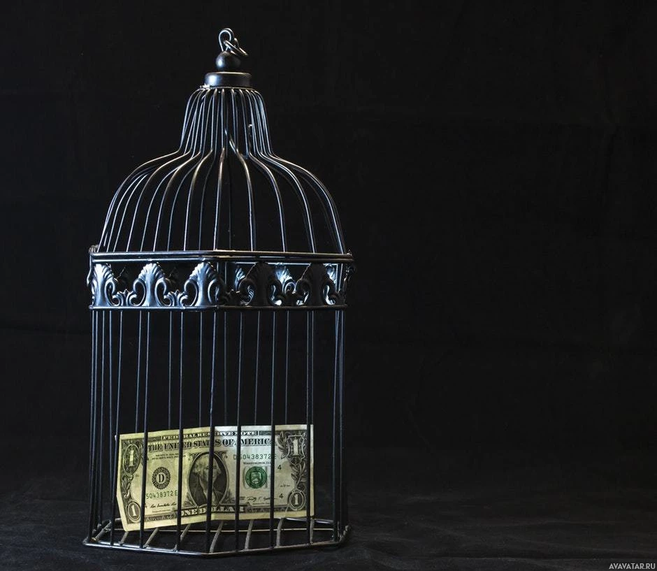 На картине изображена клетка с деньгами внутри. Этот образ часто используется для обозначения финансовой свободы или идеи экономии денег для будущего использования, таких как выход на пенсию или непредвиденные расходы.