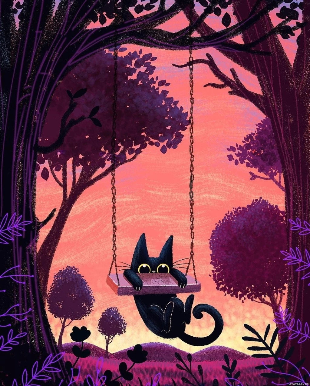 a warm glow. There are trees and other vegetation around the cat and the swing. The cat is looking over its shoulder towards the viewer, with its mouth slightly open as if it's meowing or singing. There's a whimsical and peaceful atmosphere to the image.