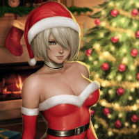 a female character dressed in a Santa Claus costume. She is seated and holding