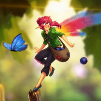 an animated character with pink hair, wearing a green top and shorts. The character has wings on their back, suggesting that they might be a fairy or some other