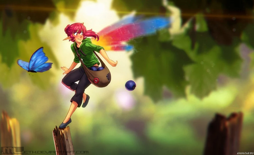 natural environment with trees and grass around. There is also a butterfly flying nearby. The style of the image is reminiscent of fantasy or fairy tale illustrations, capturing a moment of joyful action.