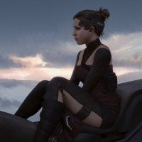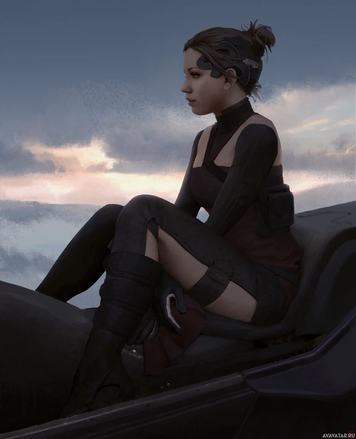 a female character with brunette hair, sitting on the back of a vehicle that resembles a motorcycle or a specialized bike designed for off-road use. She is wearing a black and grey armor-like outfit with knee-high boots, suggesting she might be engaged in some