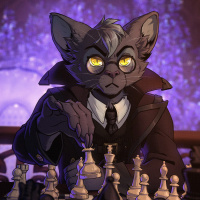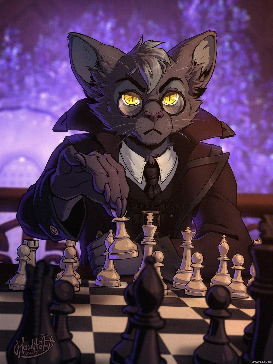 a suit with a tie. This character is seated at a chessboard, engaged in