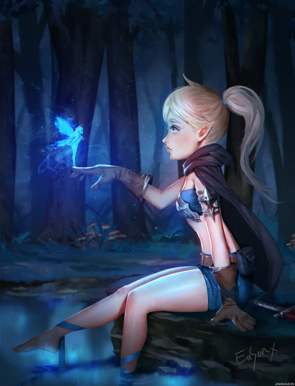 a blue ribbon in her hair. In her hand, she holds a small fairy that is casting
