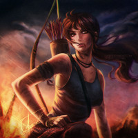 an animated character who appears to be a female archaeologist or explorer. She is holding a bow and arrow, ready for combat, with a determined expression on her face. In the background, there are elements of fire and destruction, which suggests a chaotic or dangerous environment. The artwork has a dramatic style, with emphasis on
