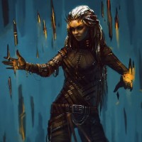 a fantasy setting. This individual has distinctive features such as elongated ears, pointed teeth, and an intricate costume with armor-like elements that give the impression of being from another world or