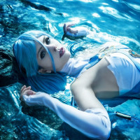 blue hair lying on her back in water. She appears to be wearing some sort of armor or outfit that has elements suggestive of aquatic or fantasy themes, such as scales and possibly a helmet or mask with