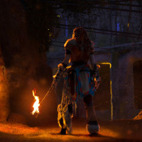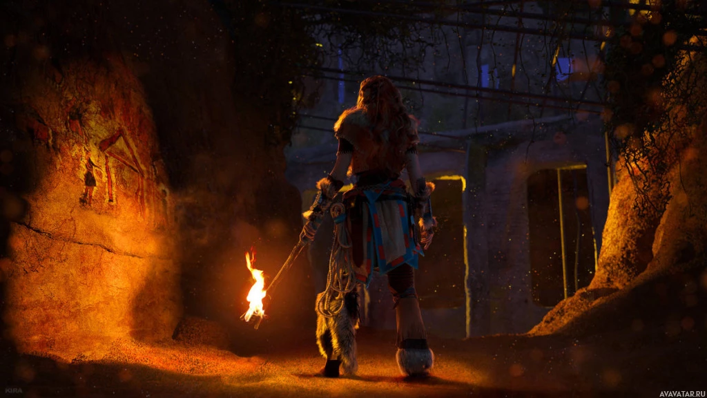 a video game, depicted in a cosplay style from behind. The character is holding a torch and appears to be standing by a wall or a structure with some