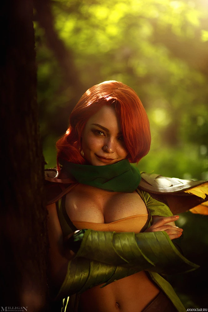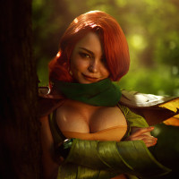 a female character from the video game Dota 2. She is depicted in cosplay, wearing a costume that resembles her appearance in the game. Her attire includes green and white clothing with what looks like a leaf pattern, suggesting a theme related to nature or possibly