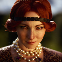 a lace collar and multiple strands of pearls around the neck. The setting seems outdoors during either sunrise or sunset, given