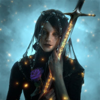magical particles floating around her, suggesting a mystical or magical element to her appearance or actions within the context of the game.