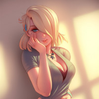 На картинке изображен иллюстрированный персонаж, который выглядит как женщина со светлыми волосами и голубыми глазами. Она носит верхнюю часть урожая, джинсовые шорты и держит руку на подбородке, как будто она глубоко в раздумьях или делает созерцательное выражение. Художественный стиль предполагает, что это может быть фан-арт из анимации или видеоигры.