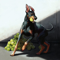 The image features a dog standing on what appears to be