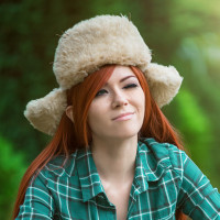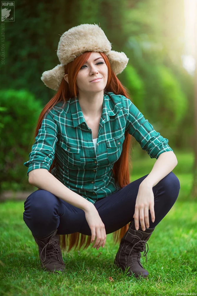 На картинке изображен человек, одетый как Венди из анимационного телесериала «Гравити Фоллс». Они позируют на открытом воздухе с игривым выражением, надев шляпу, которая напоминает фирменный стиль персонажа.