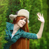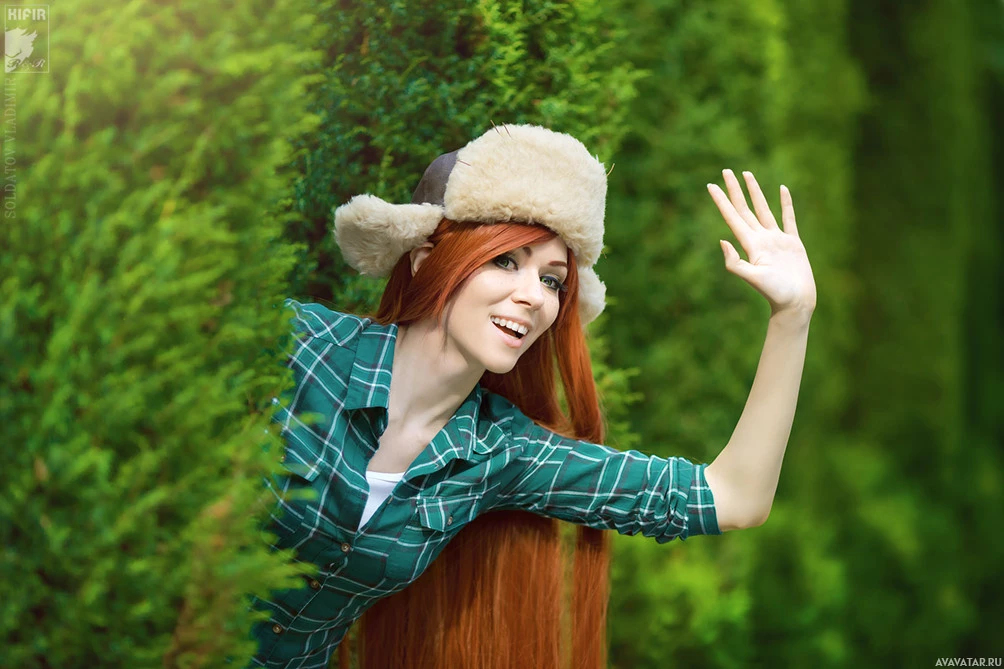 red hair styled to look like Wendy's character. They are waving at the camera and appear to be outdoors in