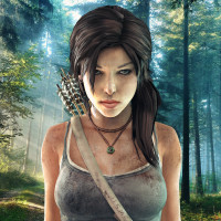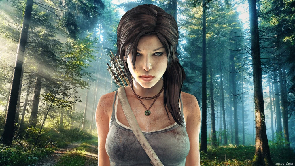 a dense forest or jungle environment, which is a common location in adventure and exploration games like this one. The character is depicted holding what looks like a climbing axe in her right hand, suggesting that she might be engaged in