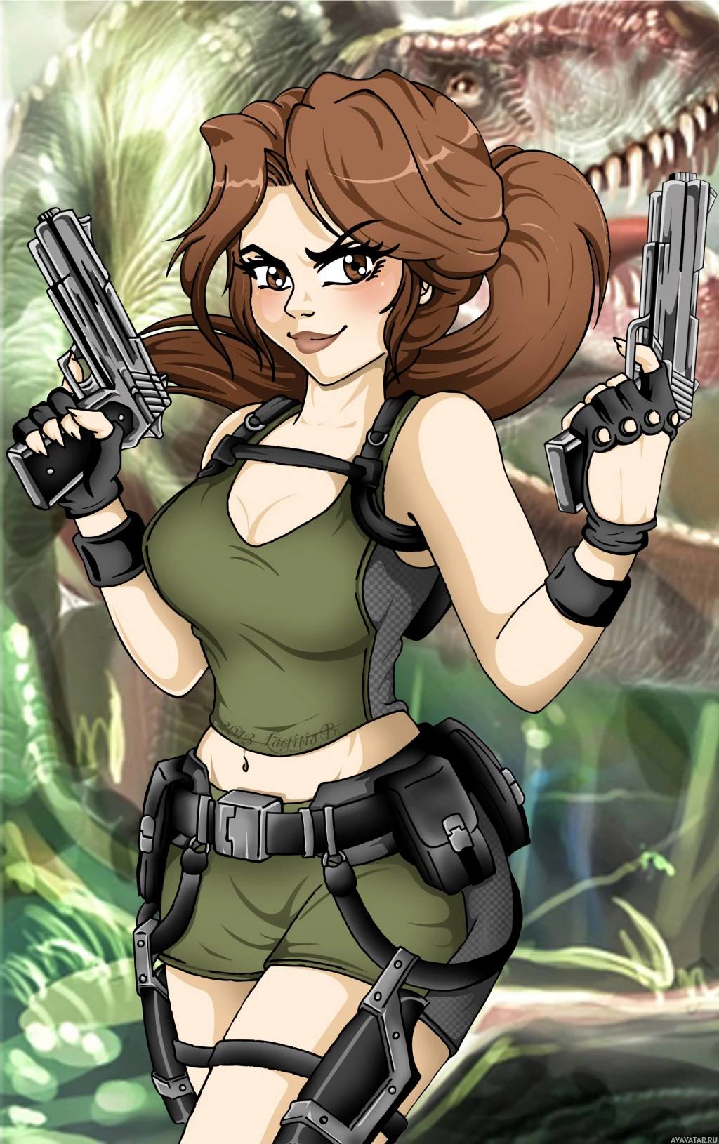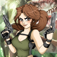 The image shows an animated character who appears to be inspired by Lara Croft, a famous