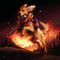 dark colors dominating the scene, and the fire adds a sense of urgency to the depiction. The dog's attire and the backpack suggest that it may be involved in some kind of adventure or rescue mission.