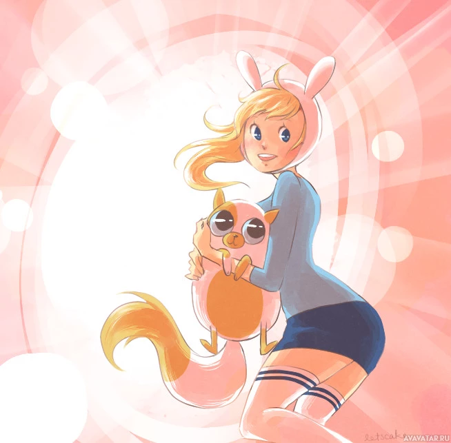 Adventure Time." She is holding a small, cute creature that resembles an owl with