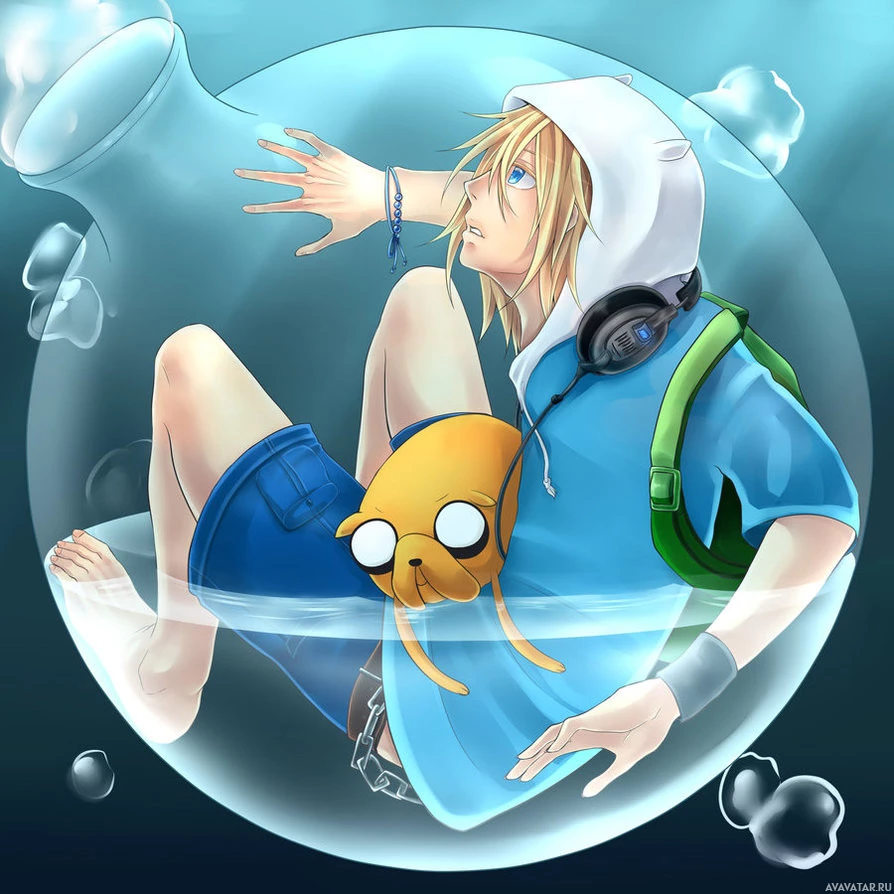 a transparent bubble floating in water. With him is Jake the Dog, also from the same
