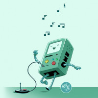 На картинке изображен персонаж, который выглядит как BMO из анимационного телесериала «Время приключений». BMO изображается с музыкальными нотами, плавающими вокруг головы, предполагая, что он играет или наслаждается музыкой. Он также держит микрофон, подчеркивая свою музыкальную активность. Фон прост и не содержит дополнительного контекста или информации, которая указывала бы на анимационный фильм.