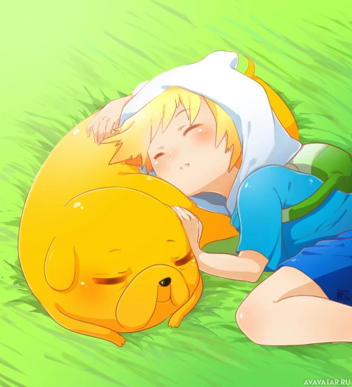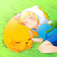 Adventure Time," Finn the Human and Jake the Dog, who are depicted in a cozy and relaxed setting. Finn is lying down with his head resting on Jake's belly, both appearing to be asleep or napping under the sunlight. The characters are stylized and colorful, typical of the show's animation style.