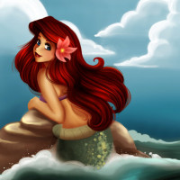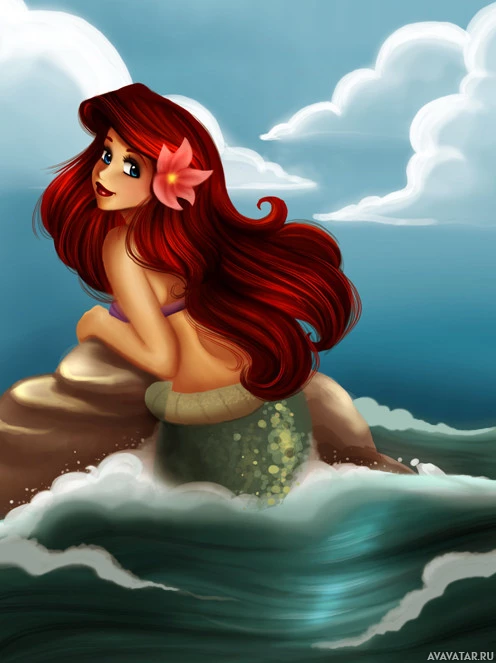 an animated character who appears to be Ariel, a mermaid from the Disney movie "The Little Mermaid." She is shown sitting on a rock in the ocean with her