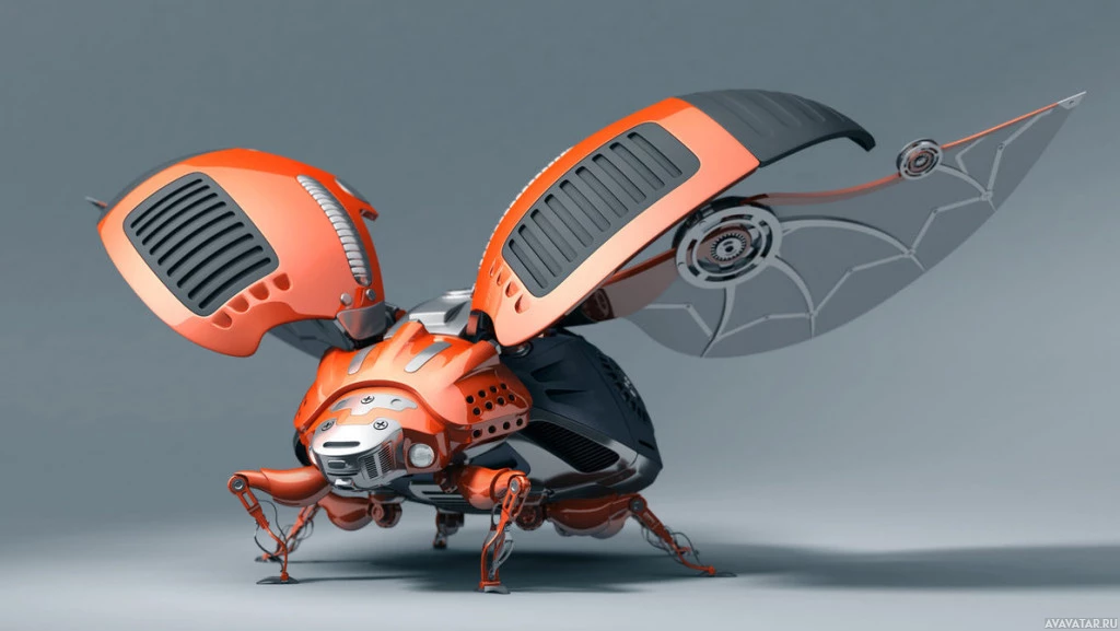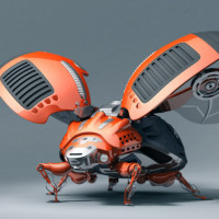 The image features a robot that resembles an insect, possibly a beetle, given its