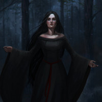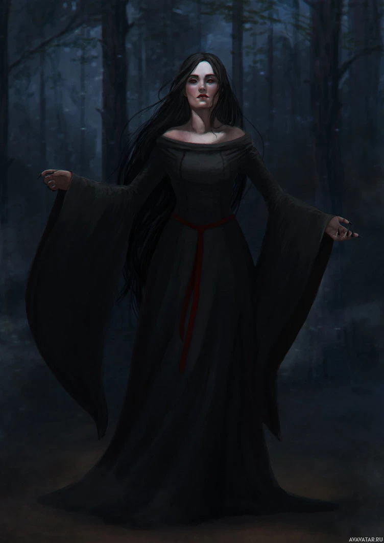 The image shows a woman dressed in what appears to be a medieval-style dress, reminiscent of witches or sorceresses from fantasy literature and media. She has long
