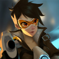 the video game "Overwatch." She is holding a gun and appears to be aiming it at something or someone. Tracer is known for her ability to teleport
