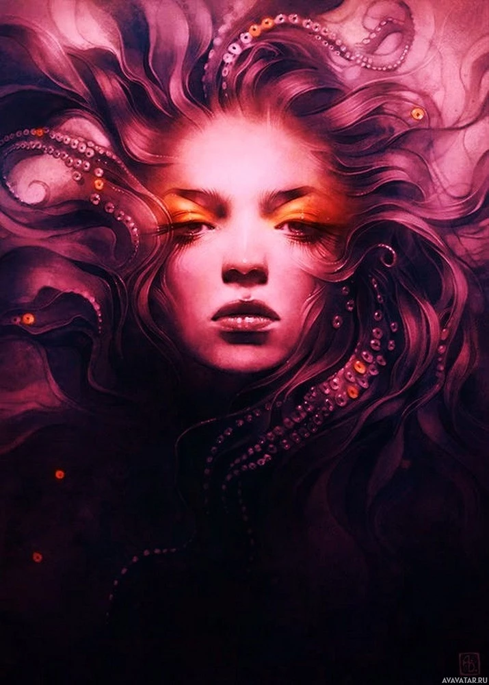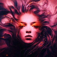 a thoughtful expression on her face and is adorned with what appears to be a mystical or fantastical element, possibly a fairy-like headpiece or a mask with intricate patterns. Her eyes are looking directly at the viewer, creating