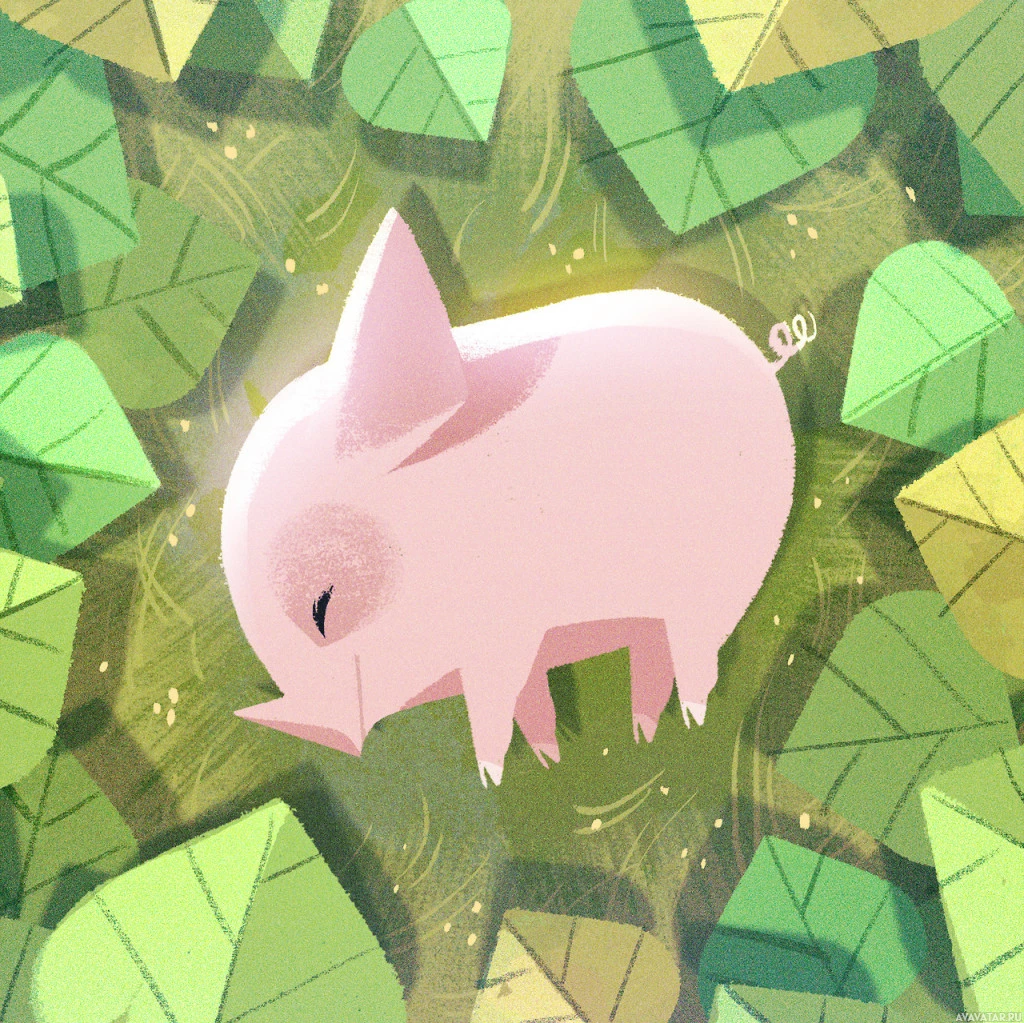 green leaves around it. The pig looks content and relaxed. It's a whimsical illustration likely meant for a younger audience due to its cute and simple design.