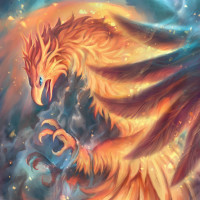 mythical creature is depicted with wings and tail feathers resembling those of a bird, often associated with fire or flame. It is set against an ethereal background with swirling clouds and sparkles, which adds to