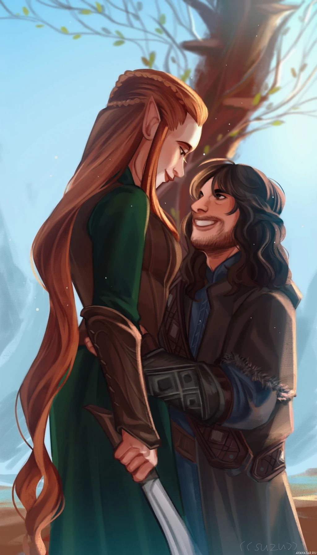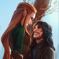 a serene setting that might suggest they are in the outdoor areas of Middle-earth, which could be consistent with Tauriel's character as she is known to inhabit the region.