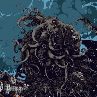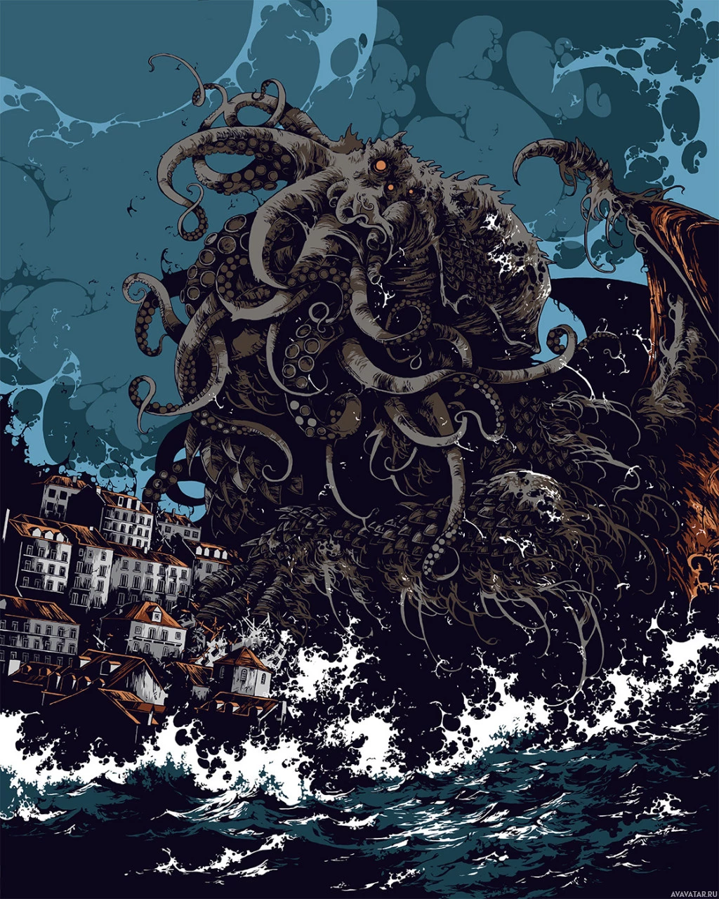several tentacles and appears menacing, suggesting it might be a representation of Cthulhu from the works of H.P. Lovecraft, which are well-known for their cosmic horror elements. In the background, there is a small, picturesque coastal town with buildings that seem to be from