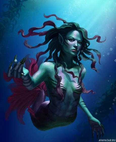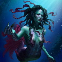 a mermaid character. She has long, flowing hair and is adorned with shells or possibly seaweed on her head. Her eyes are closed, and she appears to be in