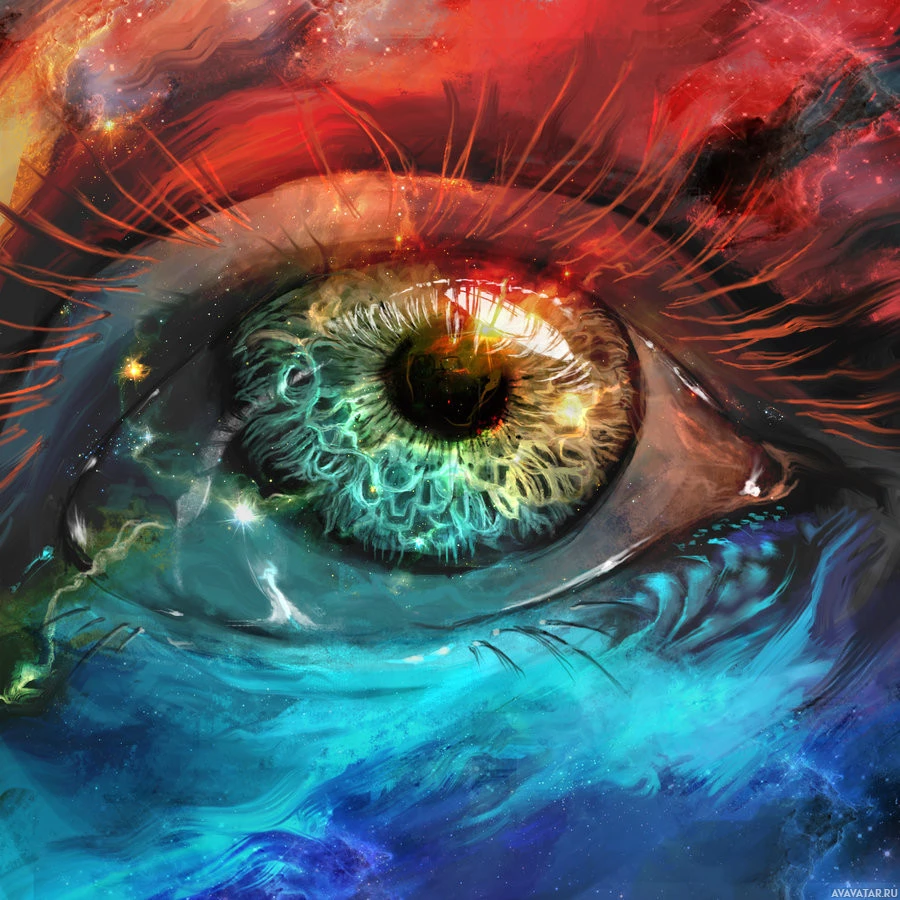 intricate designs or symbols that appear to be swirling around the pupil, suggesting a mystical or cosmic theme. The background seems to represent an abstract