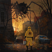 a hazmat suit, holding a canister and seemingly in the act of spraying it. This figure appears to be looking towards