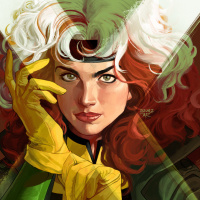 The image depicts a character known as Rogue from the X-Men. She is portrayed with