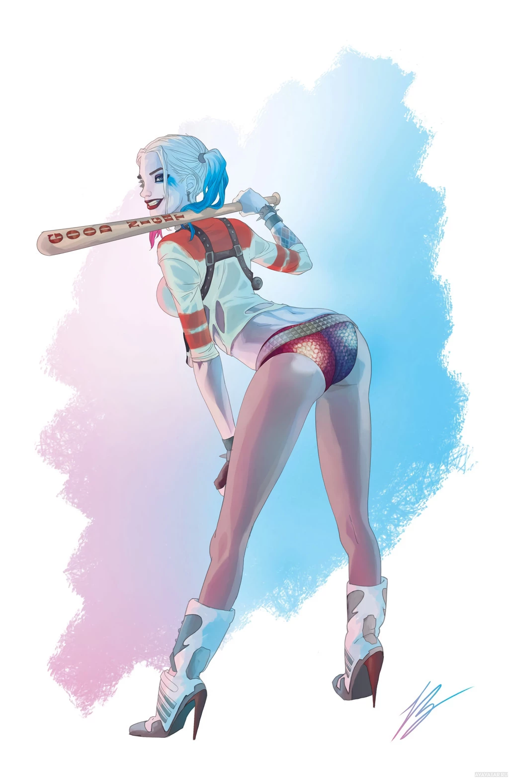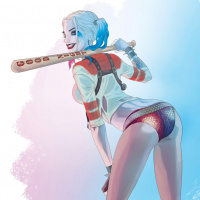 Harley Quinn, a fictional character from the Batman universe. She is depicted with her signature outfit and props: red and blue attire,