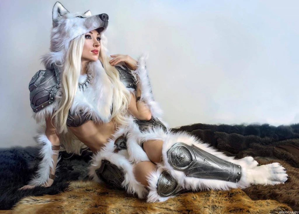 armor pieces adorned with fur designs that complement the helmet. The person is also wearing a breastplate with a design that mimics a wolf's chest pattern. They are posing with one leg crossed over the other in a relaxed manner, and there's a backdrop that resembles