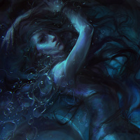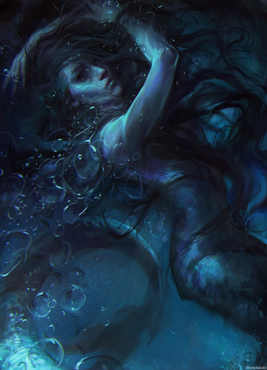 a creature of the sea. Her skin has a pale tone and her eyes are closed as if she is in