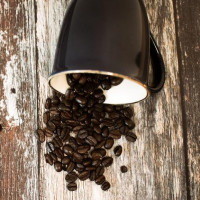 На картинке изображена черная кофейная кружка с некоторыми кофейными зернами, выливающимися из нее на деревянную поверхность. Обстановка предполагает, что кружка либо наливалась, либо была перебита, в результате чего кофейные зерна выпали.