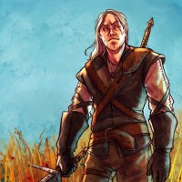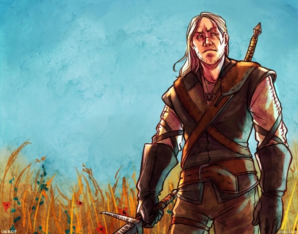 The image depicts an illustrated character that appears to be Geralt of Rivia, a protagonist from