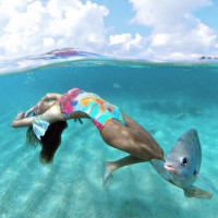 a colorful swimsuit, likely in a snorkeling or scuba diving activity. They are lying on their