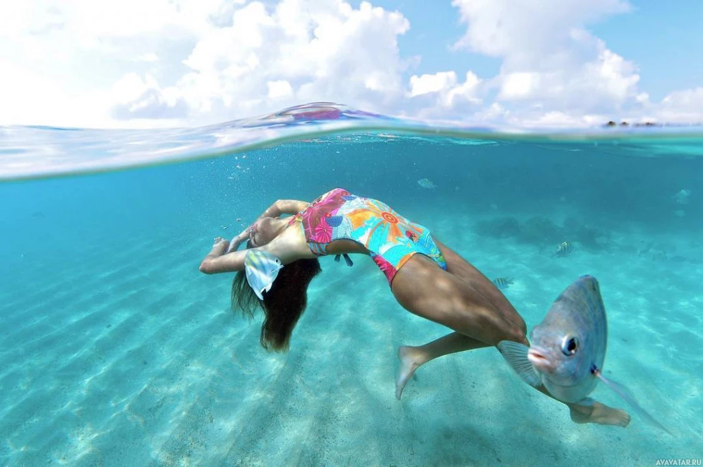 back in the water, looking up towards the surface. A fish is visible near them, possibly