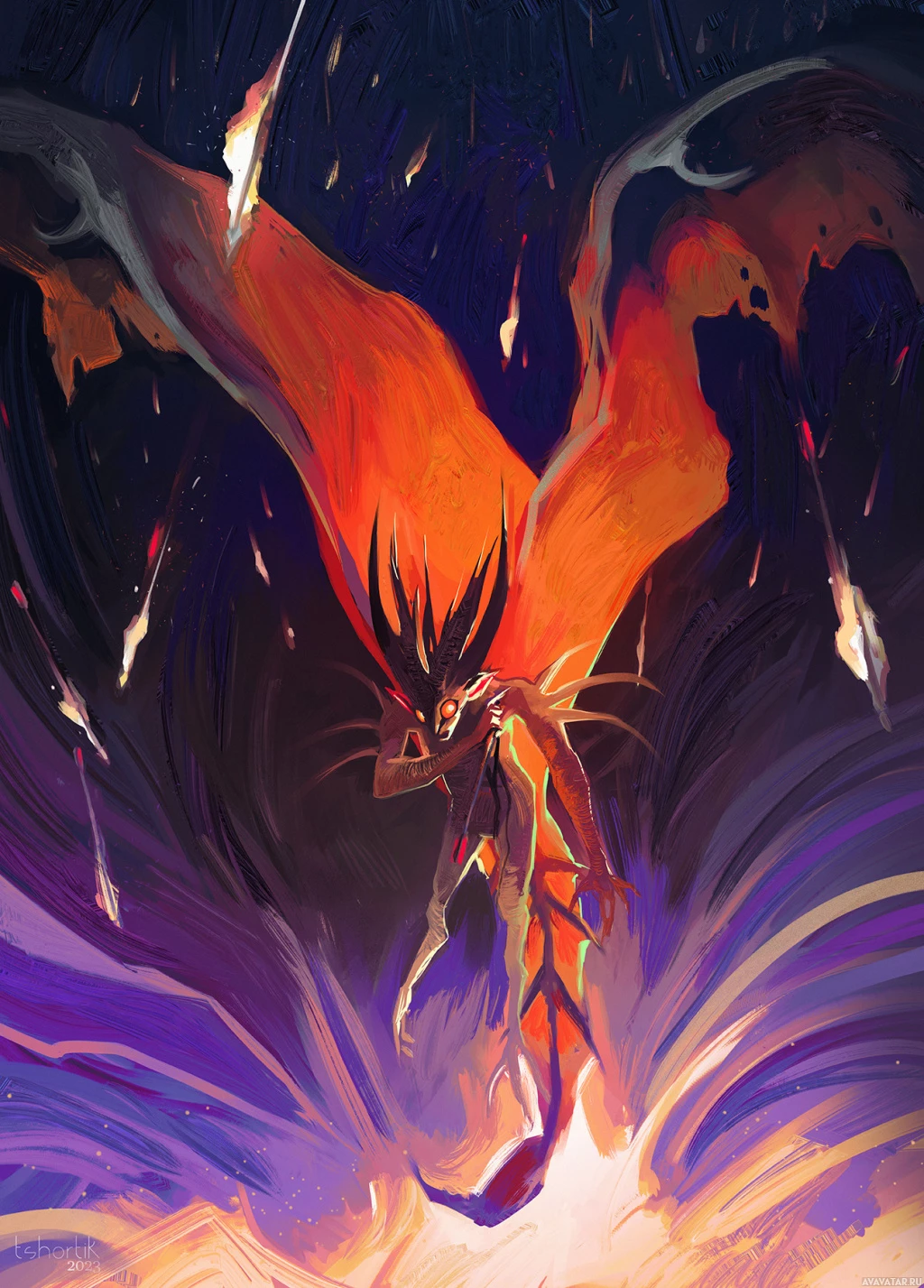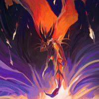 a dynamic pose, possibly mid-flight or performing some sort of action, with sparks and flames surrounding them. The color palette is dominated by