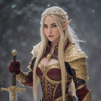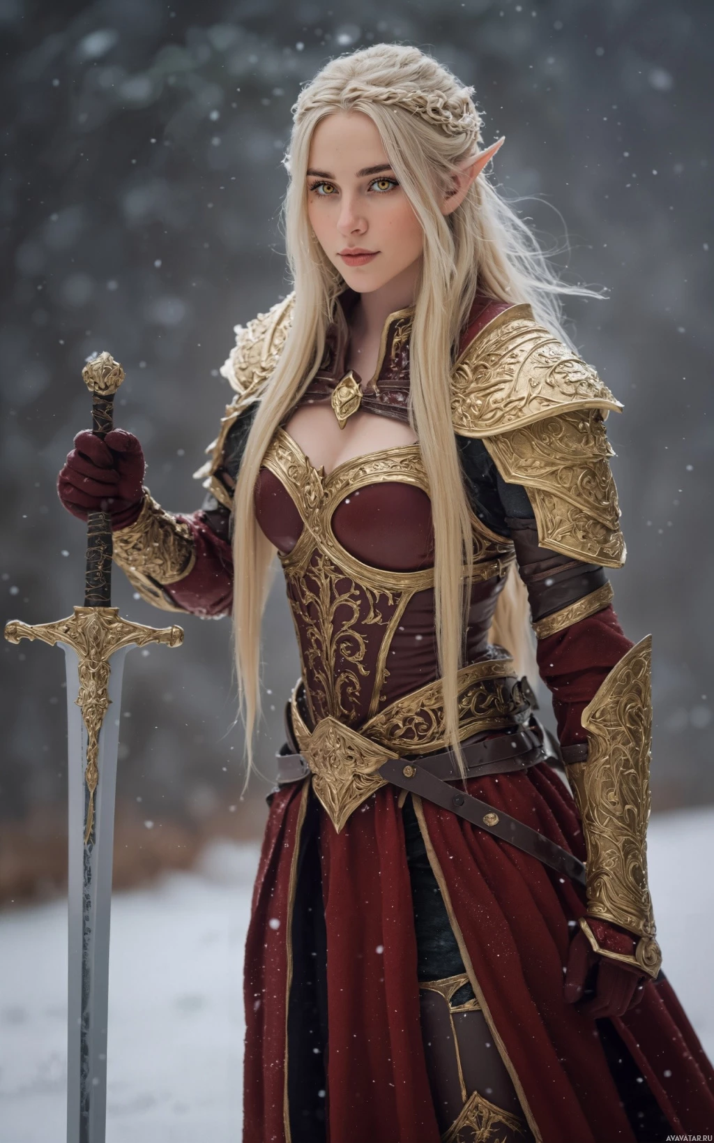 blonde hair, a red corset-style top with gold detailing, and matching arm guards that appear to be part of the same set as the chest piece. They are also holding a sword with a metallic hilt in their right hand, which complements the overall fantasy theme. The background suggests a cold, possibly snowy environment with trees and